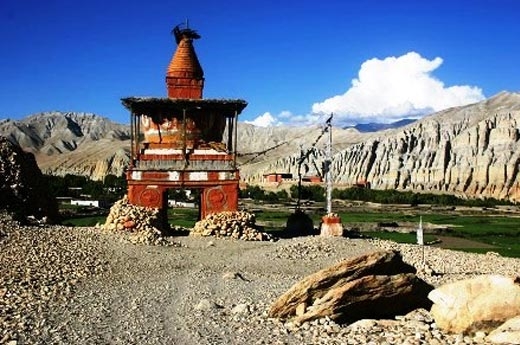 From Kagbeni to Tzug; as you walk towards north the Kali Gandaki valley extends and becomes broader. Walk to Samar; it is surrounded by the ruins of temples and fortes. Visit the famous cave at Rongbyoung Chorten. It has carvings of many deities on the stone walls: the figure of Padmasambhava dominates all the deities. The famous cave speaks of the history of this valley of Lo before the advent of Buddhism. The travel from Giling to Tsarang pass through important ruins at Gemi. As Tsarang is approached after crossing the passes the monastery is evidently visible. In the monastery the fresco painting of thousand Buddha, hanging thankas and antique ceiling, and other sacred objects are reminder of its rich cultural past.